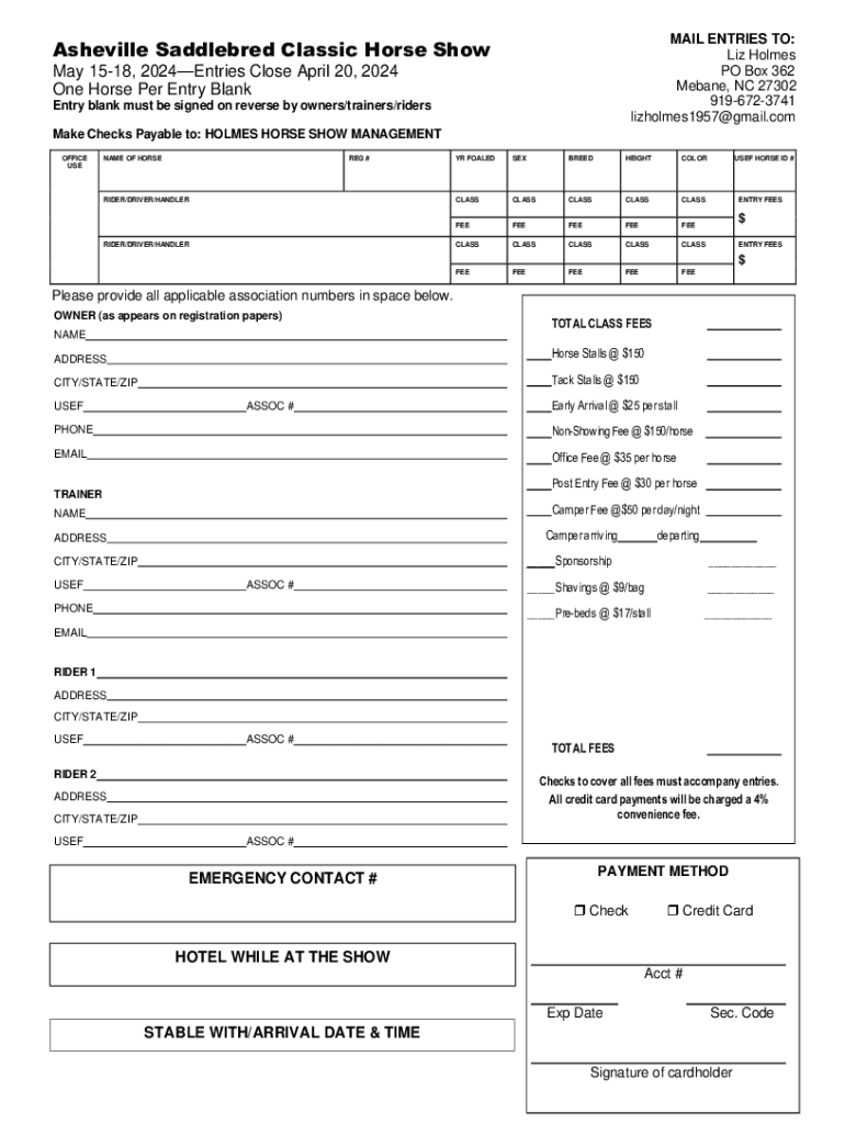 MAIL ENTRIES TO: Liz Holmes PO Box 362 Mebane, NC 27302 9196723741 lizholmes1957@gmail.comAsheville Saddlebred Classic Horse Show May 1518, 2024Entries Close April 20, 2024 One Horse Per Entry Blank