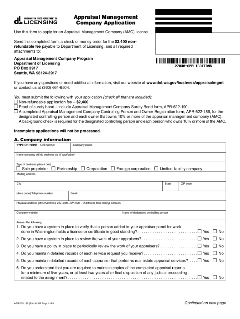 Click here to START or CLEAR, then hit the TAB buttonAppraisal Management Company Application Use this form to apply for an Appraisal Management Company (AMC) license. Send this completed form, a