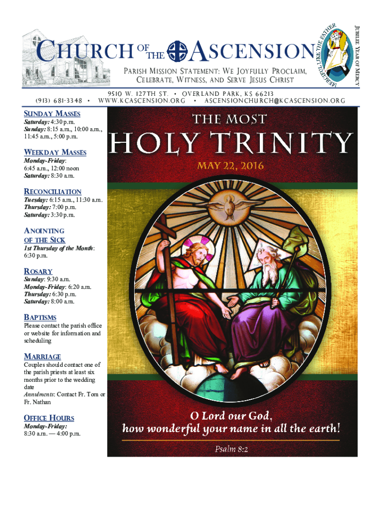 ASCENSIONP ARISH M ISSION S TATEMENT : W E J OYFULLY P ROCLAIM , C ELEBRATE , W ITNESS , AND S ERVE J ESUS C HRIST(913) 68133489510 W. 127th St. Overland Park, KS 66213 www.kcascension.org ascensionchurch@kcascension.orgSUNDAY