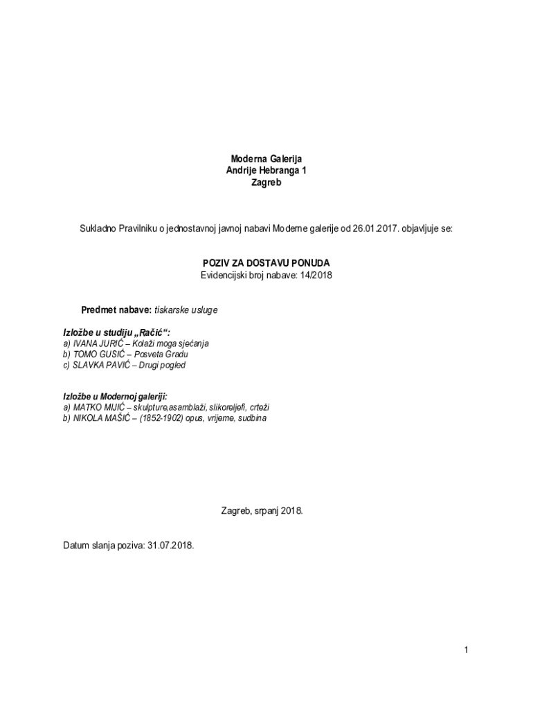 Moderna Galerija Andrije Hebranga 1 ZagrebSukladno Pravilniku o jednostavnoj javnoj nabavi Moderne galerije od 26.01.2017. objavljuje se: POZIV ZA DOSTAVU PONUDA Evidencijski broj nabave: 14/2018