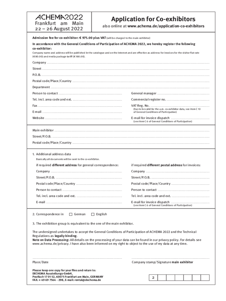 Application for CoexhibitorsFrankfurt am Main 22 26 August 2022also online at www.achema.de/applicationcoexhibitorsAdmission fee for coexhibitor: 975.00 plus VAT (will be charged to the main exhibitor)