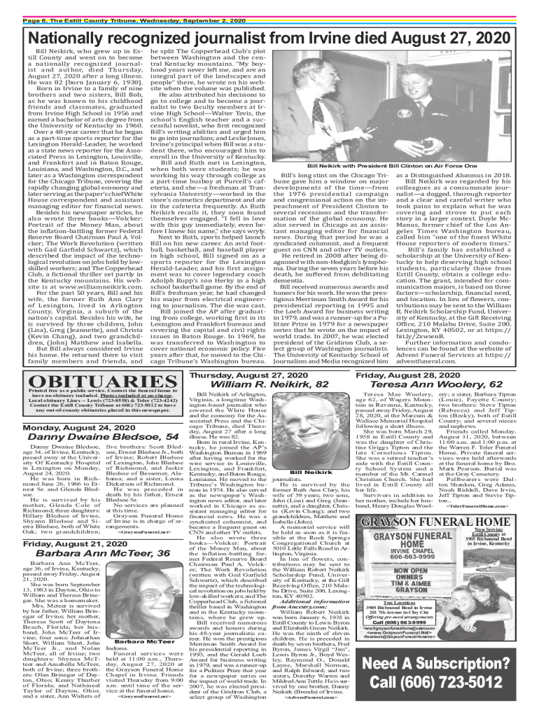 Page 6, The Estill County Tribune, Wednesday, September 2, 2020Nationally recognized journalist from Irvine died August 27, 2020Bill Neikirk, who grew up in Estill County and went on to become a nationally