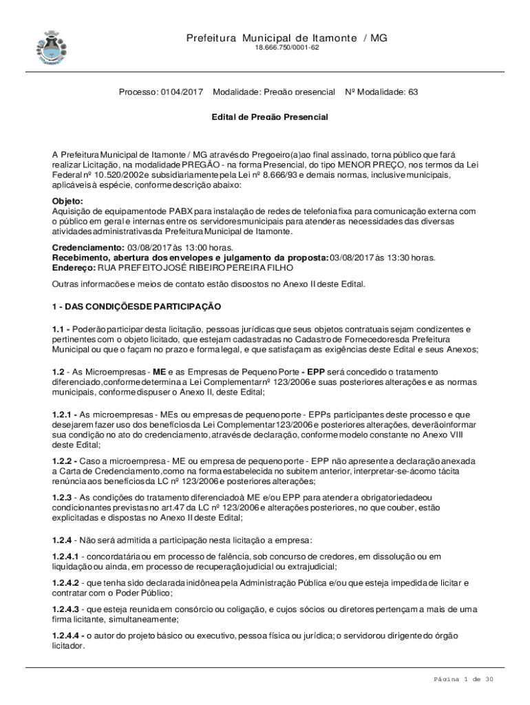 Prefeitura Municipal de Itamonte / MG 18.666.750/000162Processo: 0104/2017Modalidade: Prego presencialN Modalidade: 63Edital de Prego PresencialA PrefeituraMunicipal de Itamonte / MG atravsdo Pregoeiro(a)ao