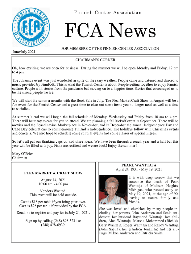Finnish Center AssociationFCA News June/July 2021FOR MEMBERS OF THE FINNISH CENTER ASSOCIATION CHAIRMANS CORNEROh, how exciting, we are open for business! During the summer we will be open Monday