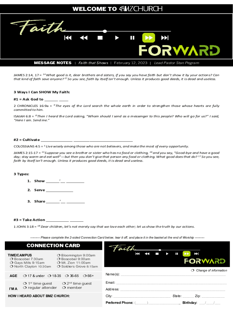 WELCOME TOMESSAGE NOTES | Faith that Shows | February 12, 2023 | Lead Pastor Stan Pegram JAMES 2:14, 17 14 What good is it, dear brothers and sisters, if you say you have faith but dont show it by