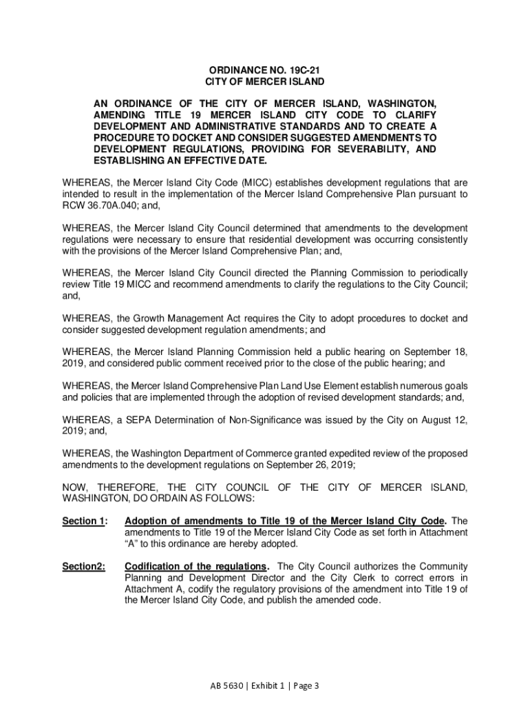 ORDINANCE NO. 19C21 CITY OF MERCER ISLAND AN ORDINANCE OF THE CITY OF MERCER ISLAND, WASHINGTON, AMENDING TITLE 19 MERCER ISLAND CITY CODE TO CLARIFY DEVELOPMENT AND ADMINISTRATIVE STANDARDS AND TO
