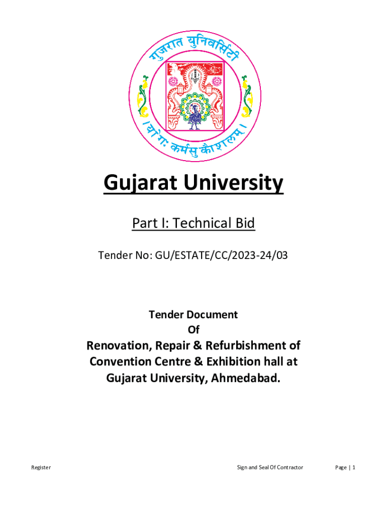 Gujarat University Part I: Technical Bid Tender No: GU/ESTATE/CC/202324/03Tender Document OfRenovation, Repair & Refurbishment of Convention Centre & Exhibition hall at Gujarat University, Ahmedabad.RegisterSign