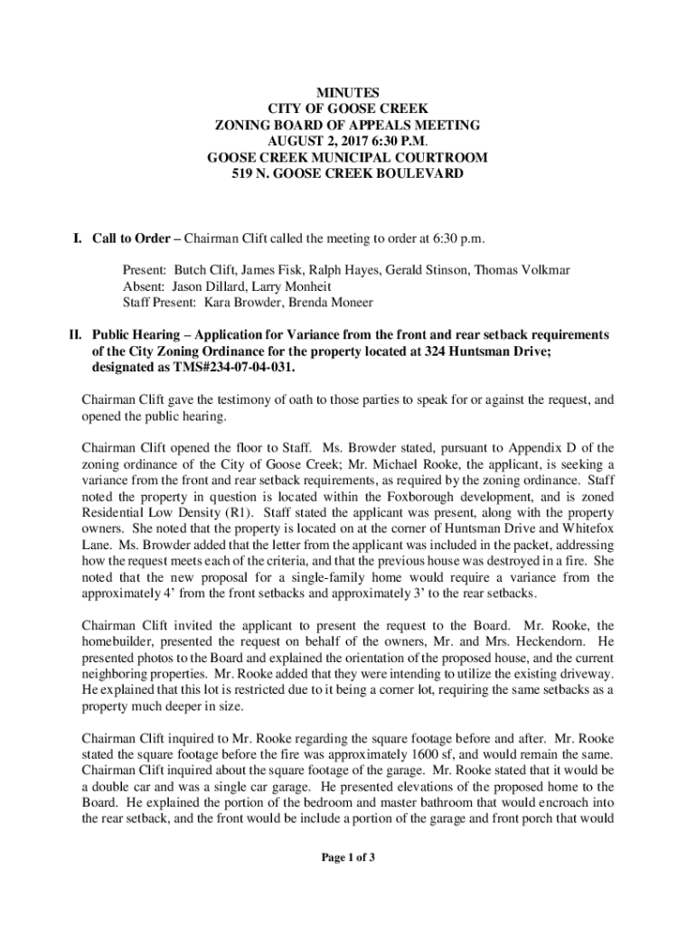 MINUTES CITY OF GOOSE CREEK ZONING BOARD OF APPEALS MEETING AUGUST 2, 2017 6:30 P.M. GOOSE CREEK MUNICIPAL COURTROOM 519 N. GOOSE CREEK BOULEVARDI. Call to Order Chairman Clift called the meeting