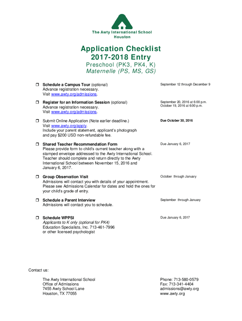 Application Checklist 20172018 Entry Preschool (PK3, PK4, K) Maternelle (PS, MS, GS) Schedule a Campus Tour (optional) Advance registration necessary. Visit www.awty.org/admissions.September 12 through