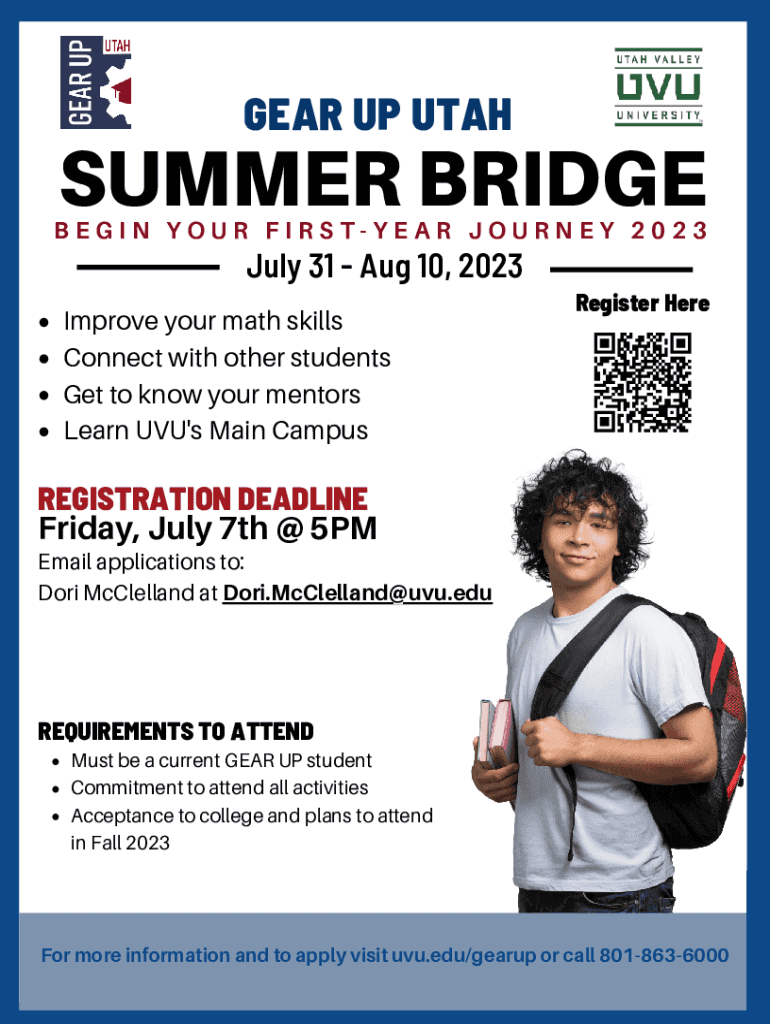 GEAR UP UTAHSUMMER BRIDGEBEGIN YOUR FIRSTYEAR JOURNEY 2023July 31 Aug 10, 2023Improve your math skills Connect with other students Get to know your mentors Learn UVU\'s Main CampusRegister HereREGISTRATION