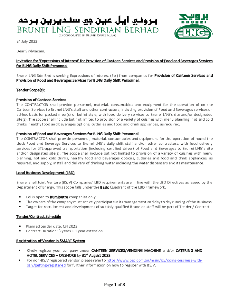 24 July 2023 Dear Sir/Madam, Invitation for Expressions of Interest for Provision of Canteen Services and Provision of Food and Beverages Services for BLNG Daily Shift Personnel Brunei LNG Sdn Bhd