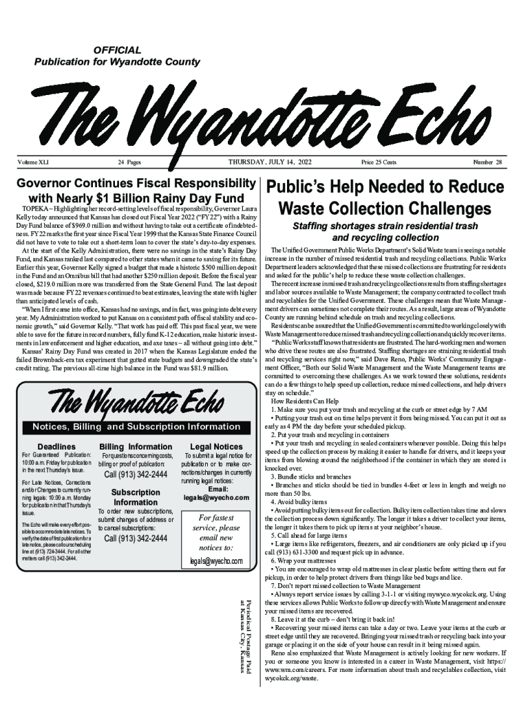 OFFICIAL Publication for Wyandotte CountyVolume XLI 24 PagesTHURSDAY, JULY 14, 2022Governor Continues Fiscal Responsibility with Nearly $1 Billion Rainy Day FundTOPEKA Highlighting her recordsetting