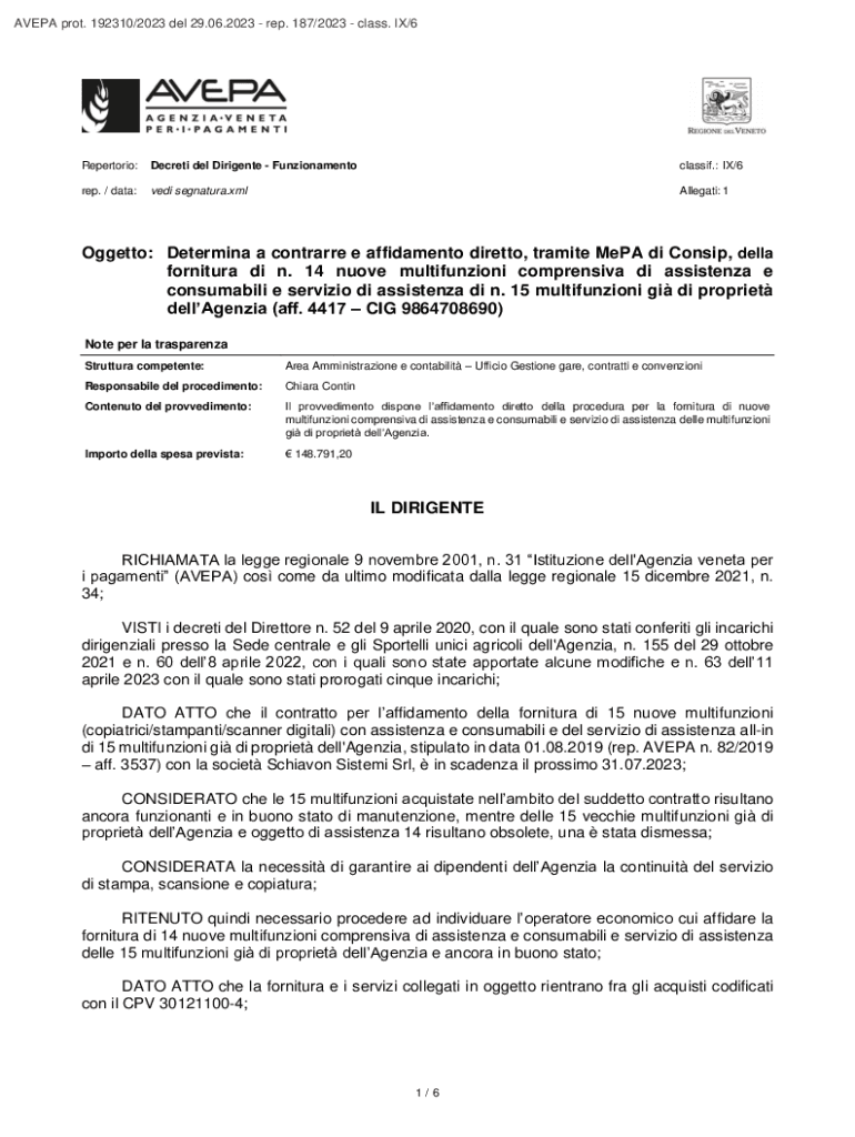 AVEPA prot. 192310/2023 del 29.06.2023 rep. 187/2023 class. IX/6Repertorio:Decreti del Dirigente Funzionamentoclassif.: IX/6rep. / data:vedi segnatura.xmlAllegati: 1Oggetto: Determina a contrarre