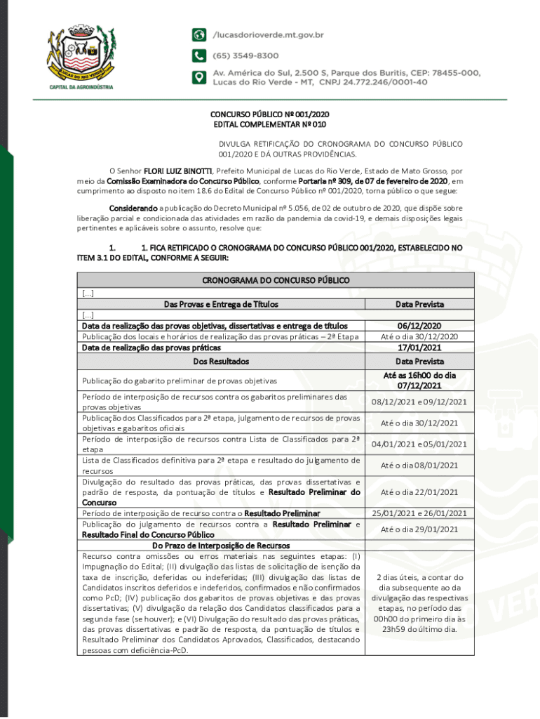 CONCURSO PBLICO N 001/2020 EDITAL COMPLEMENTAR N 010 DIVULGA RETIFICAO DO CRONOGRAMA DO CONCURSO PBLICO 001/2020 E D OUTRAS PROVIDNCIAS. O Senhor FLORI LUIZ BINOTTI, Prefeito Municipal de Lucas do