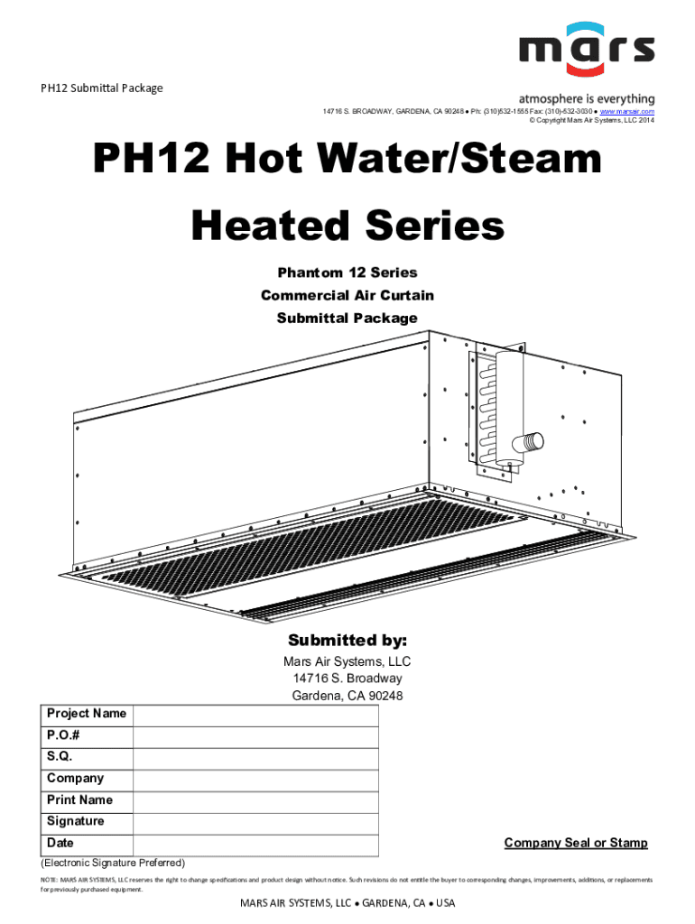 PH12 Submittal Package 14716 S. BROADWAY, GARDENA, CA 90248 Ph: (310)5321555 Fax: (310)5323030 www.marsair.com Copyright Mars Air Systems, LLC 2014PH12 Hot Water/Steam Heated Series Phantom 12 Series