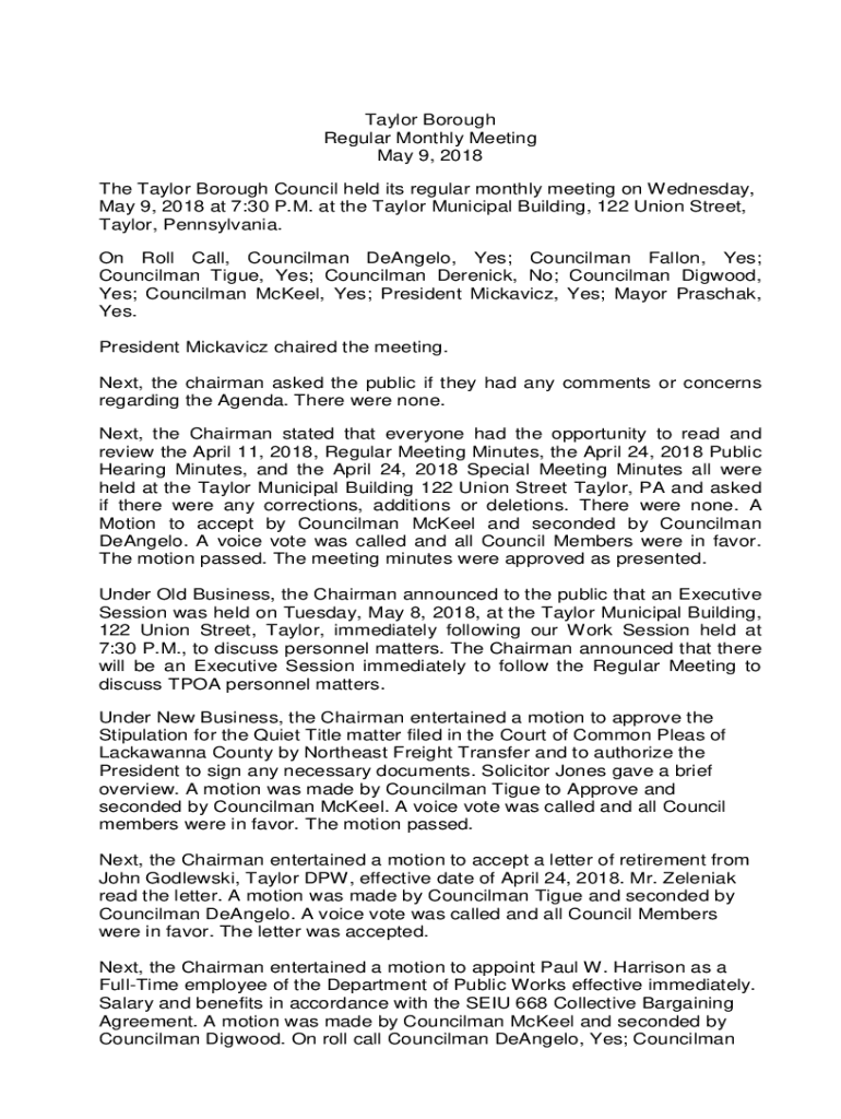 Taylor Borough Regular Monthly Meeting May 9, 2018 The Taylor Borough Council held its regular monthly meeting on Wednesday, May 9, 2018 at 7:30 P.M. at the Taylor Municipal Building, 122 Union Street,