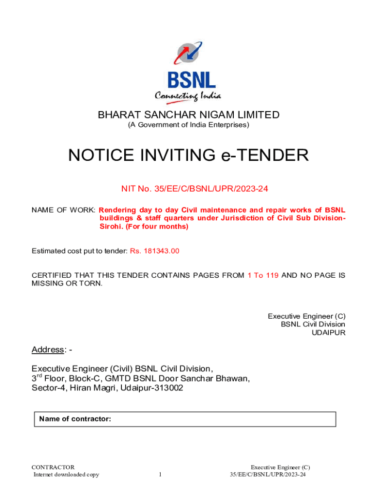 BHARAT SANCHAR NIGAM LIMITED (A Government of India Enterprises)NOTICE INVITING eTENDER NIT No. 35/EE/C/BSNL/UPR/202324 NAME OF WORK: Rendering day to day Civil maintenance and repair works of BSNL