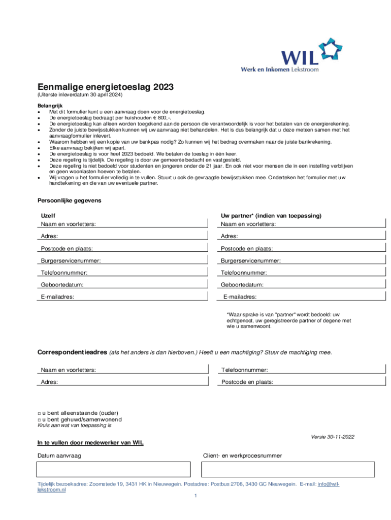 Eenmalige energietoeslag 2023 (Uiterste inleverdatum 30 april 2024) Belangrijk Met dit formulier kunt u een aanvraag doen voor de energietoeslag. De energietoeslag bedraagt per huishouden 800,. De