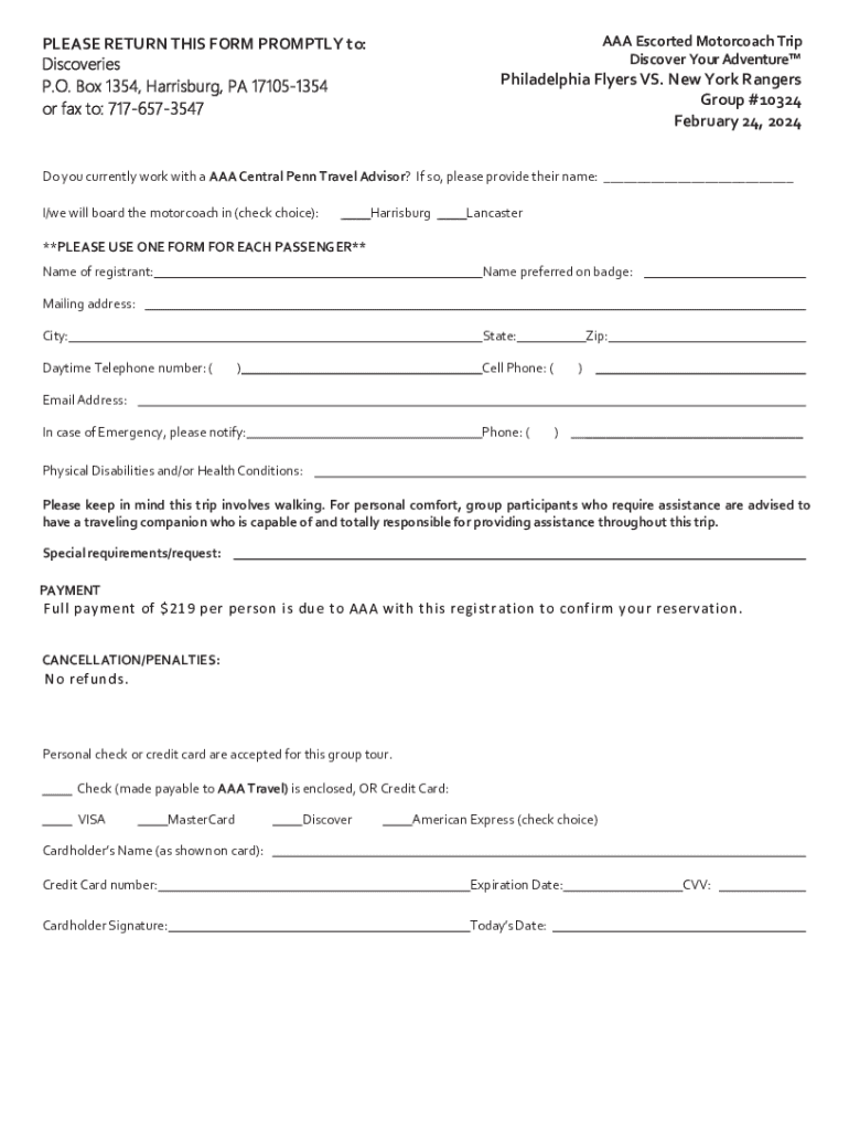 AAA Escorted Motorcoach Trip Discover Your AdventurePLEASE RETURN THIS FORM PROMPTLY to: Discoveries P.O. Box 1354, Harrisburg, PA 171051354 or fax to: 7176573547Philadelphia Flyers VS. New York Rangers