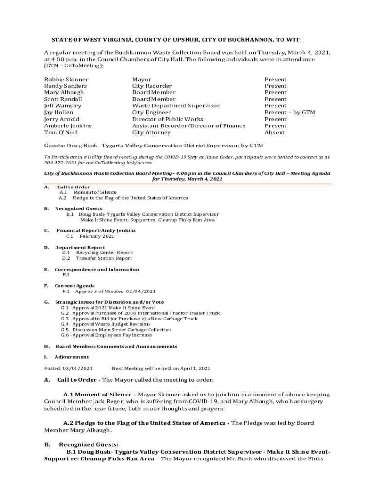 STATE OF WEST VIRGINIA, COUNTY OF UPSHUR, CITY OF BUCKHANNON, TO WIT: A regular meeting of the Buckhannon Waste Collection Board was held on Thursday, March 4, 2021, at 4:00 p.m. in the Council Chambers