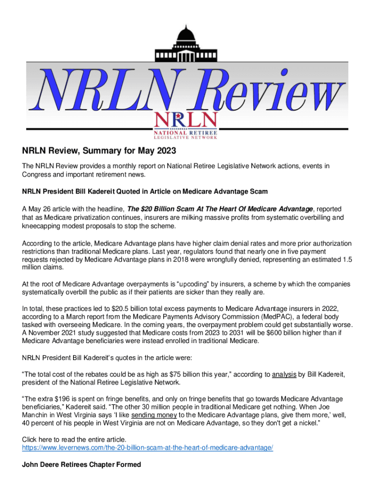 NRLN Review, Summary for May 2023 The NRLN Review provides a monthly report on National Retiree Legislative Network actions, events in Congress and important retirement news. NRLN President Bill Kadereit