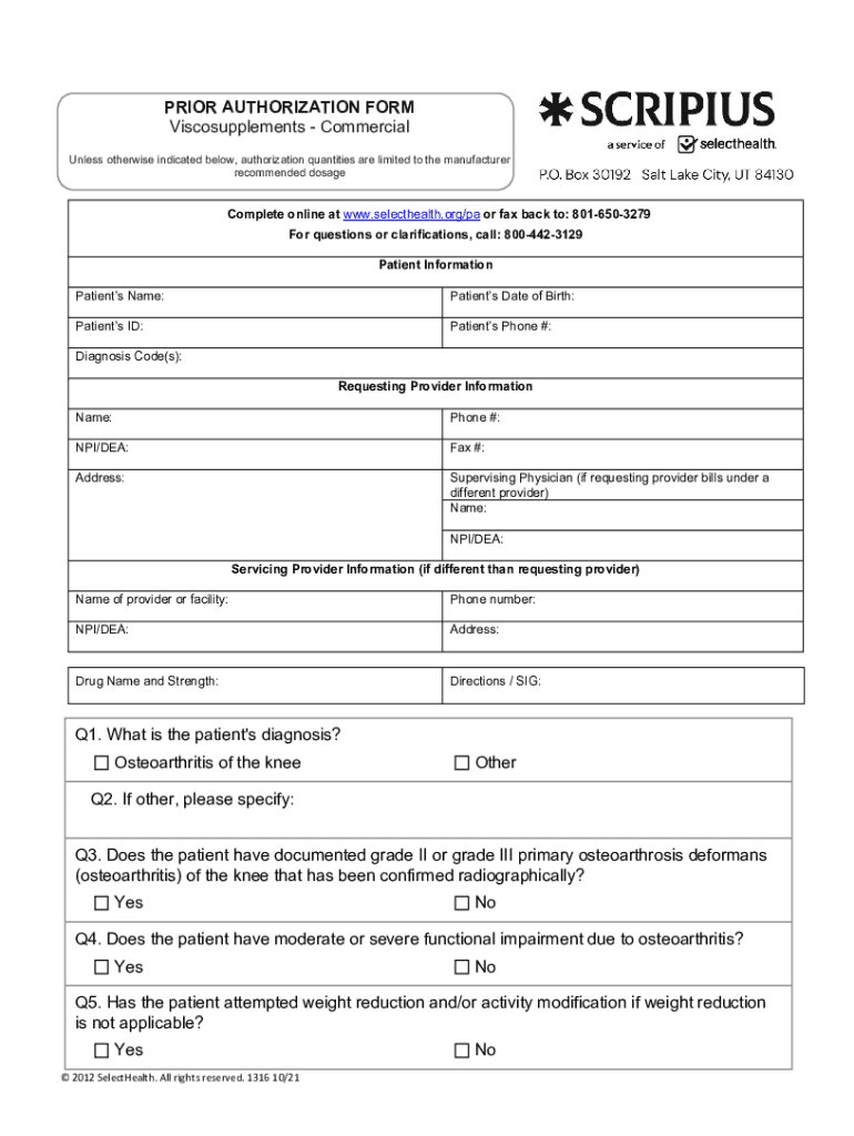 PRIOR AUTHORIZATION FORM Viscosupplements Commercial Unless otherwise indicated below, authorization quantities are limited to the manufacturer recommended dosageComplete online at www.selecthealth.org/pa