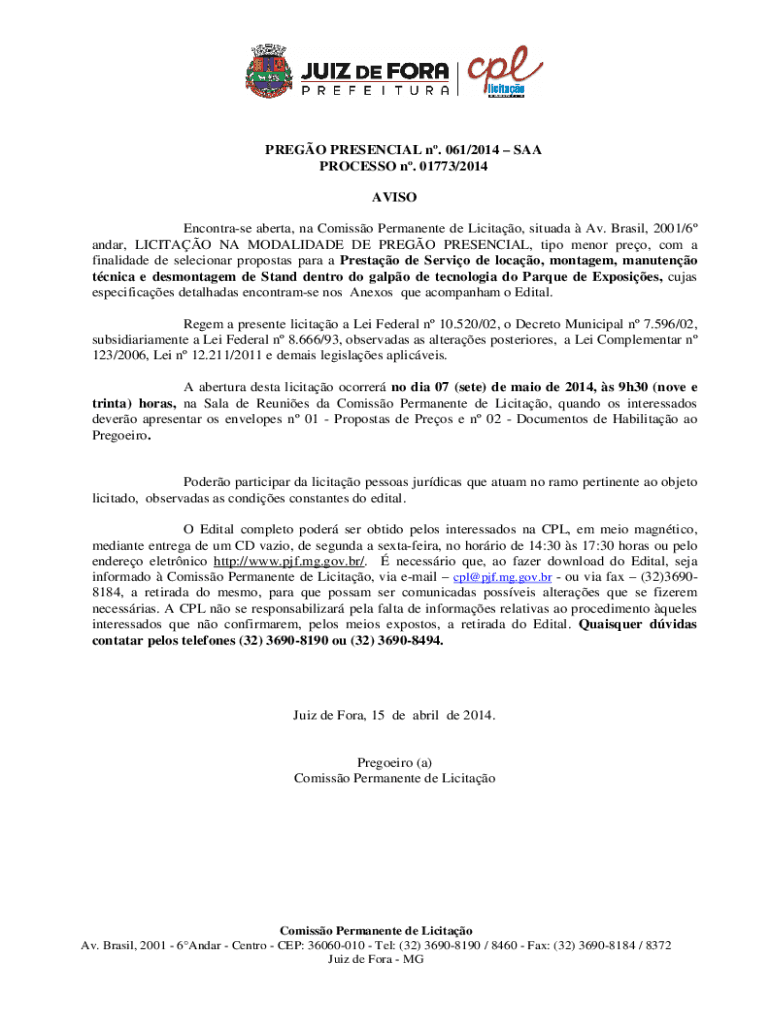 PREGO PRESENCIAL n. 061/2014 SAA PROCESSO n. 01773/2014 AVISO Encontrase aberta, na Comisso Permanente de Licitao, situada Av. Brasil, 2001/6 andar, LICITAO NA MODALIDADE DE PREGO PRESENCIAL, tipo