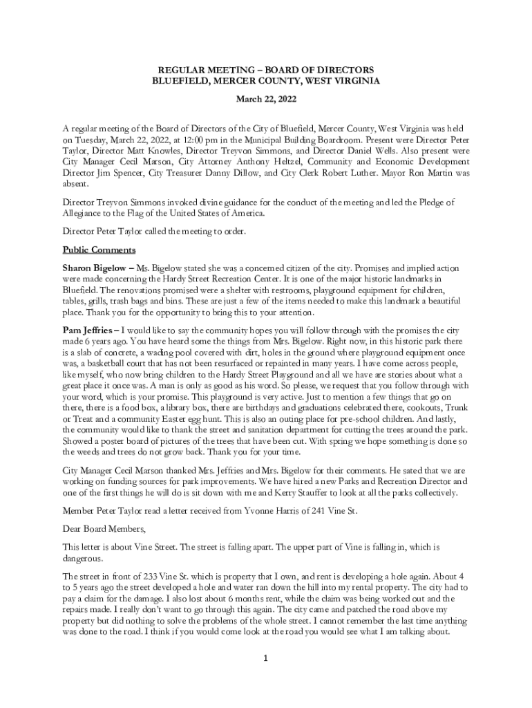 REGULAR MEETING BOARD OF DIRECTORS BLUEFIELD, MERCER COUNTY, WEST VIRGINIA March 22, 2022 A regular meeting of the Board of Directors of the City of Bluefield, Mercer County, West Virginia was held