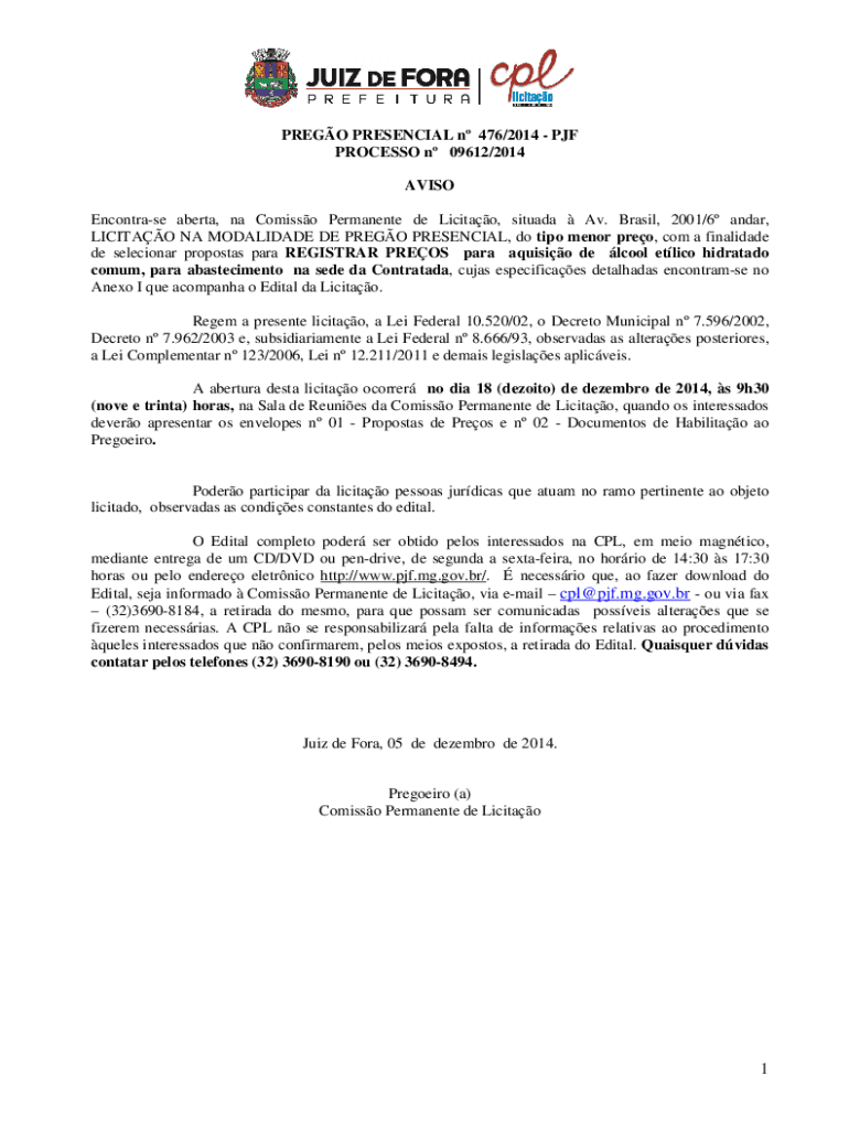 PREGO PRESENCIAL n 476/2014 PJF PROCESSO n 09612/2014 AVISO Encontrase aberta, na Comisso Permanente de Licitao, situada Av. Brasil, 2001/6 andar, LICITAO NA MODALIDADE DE PREGO PRESENCIAL, do tipo