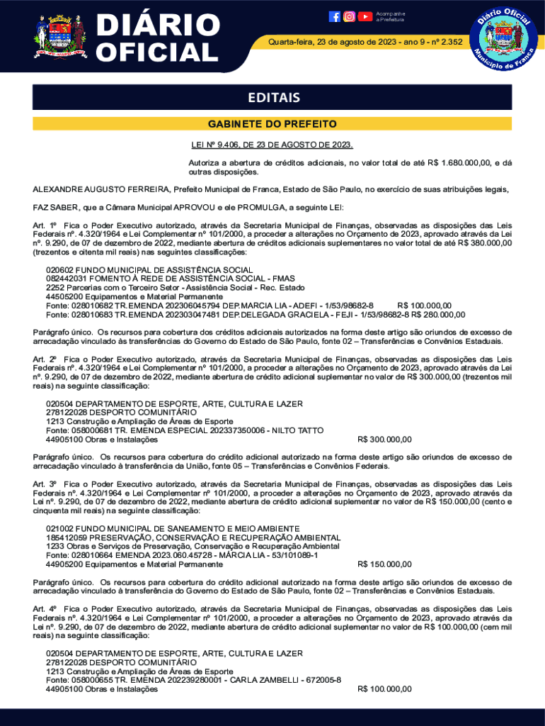 DIRIO OFICIALAcompanhe a PrefeituraQuartafeira, 23 de agosto de 2023 ano 9 n 2.352EDITAIS GABINETE DO PREFEITO LEI N 9.406, DE 23 DE AGOSTO DE 2023. Autoriza a abertura de crditos adicionais, no valor