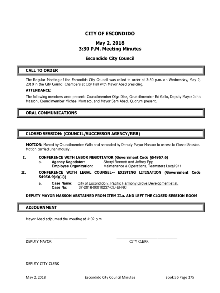 CITY OF ESCONDIDO May 2, 2018 3:30 P.M. Meeting Minutes Escondido City Council CALL TO ORDER The Regular Meeting of the Escondido City Council was called to order at 3:30 p.m. on Wednesday, May 2,