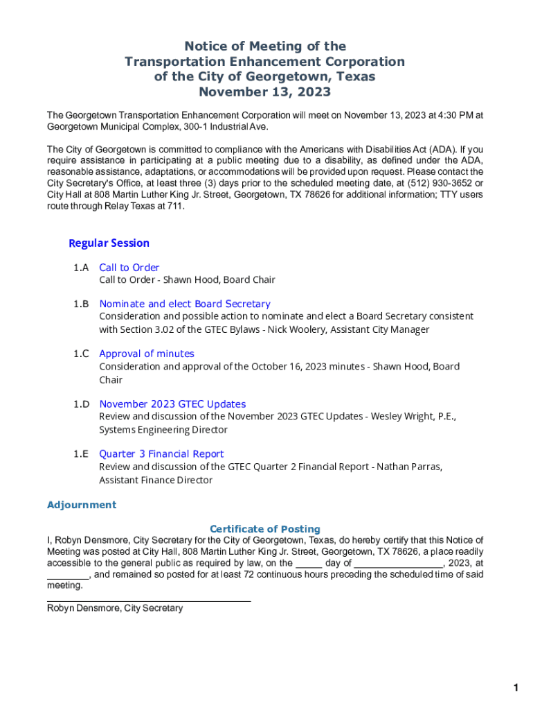 Notice of Meeting of the Transportation Enhancement Corporation of the City of Georgetown, Texas November 13, 2023 The Georgetown Transportation Enhancement Corporation will meet on November 13, 2023