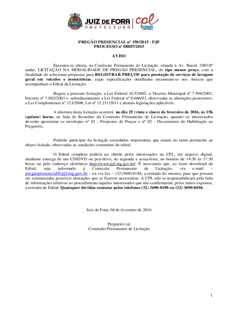PREGO PRESENCIAL n 350/2015 PJF PROCESSO n 08887/2015 AVISO Encontrase aberta, na Comisso Permanente de Licitao, situada Av. Brasil, 2001/6 andar, LICITAO NA MODALIDADE DE PREGO PRESENCIAL, do tipo