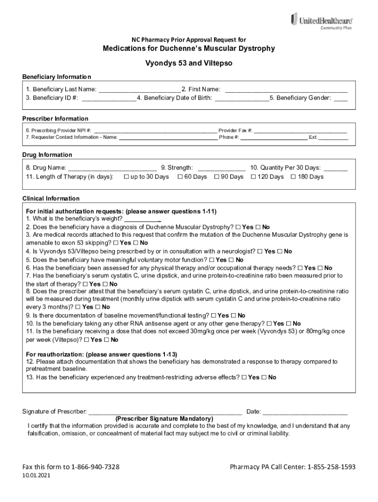 NC Pharmacy Prior Approval Request forMedications for Duchennes Muscular Dystrophy Vyondys 53 and Viltepso Beneficiary Information 1. Beneficiary Last Name: ___ 2. First Name: ___ 3. Beneficiary ID