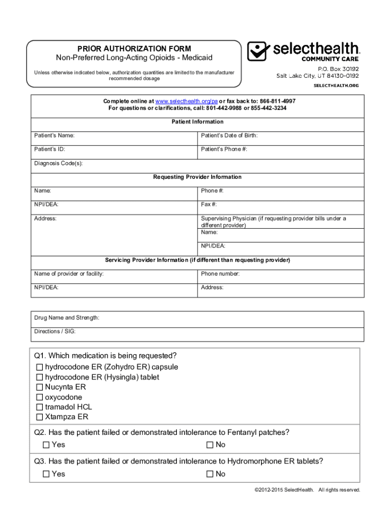PRIOR AUTHORIZATION FORM NonPreferred LongActing Opioids Medicaid Unless otherwise indicated below, authorization quantities are limited to the manufacturer recommended dosageComplete online at www.selecthealth.org/pa