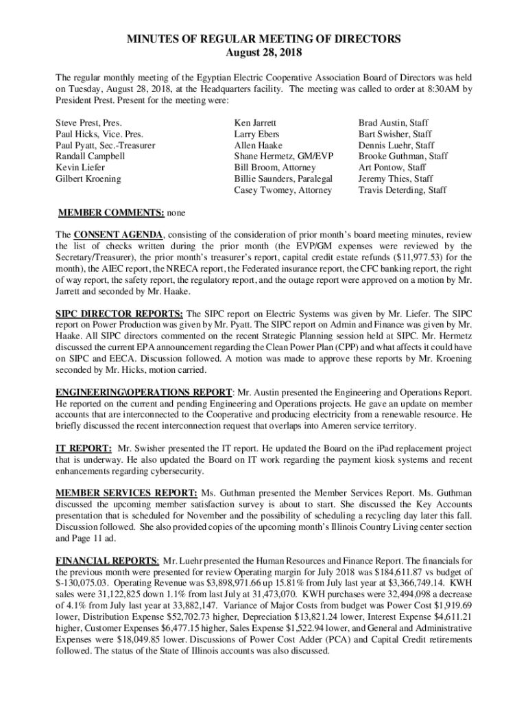 MINUTES OF REGULAR MEETING OF DIRECTORS August 28, 2018 The regular monthly meeting of the Egyptian Electric Cooperative Association Board of Directors was held on Tuesday, August 28, 2018, at the