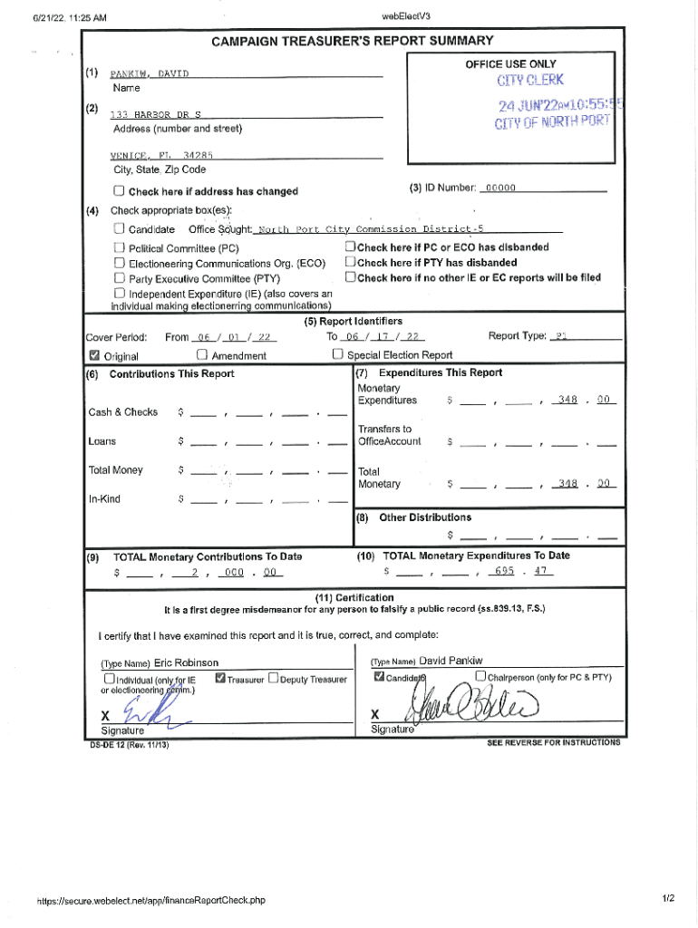 6/21/22, 11:25 AMwebElectV3CAMPAIGN TREASURER\'S REPORT SUMMARY OFFICE USE ONLY(1) PANKIW, DAVID(2)K,1;. :^Name :. ^ \';133 HARBOR PR Sir;\'i ^ IJ ^Address (number and street)iN\'w o;/ ^:.w^ V.J;:9T^\"^\'VENICE,