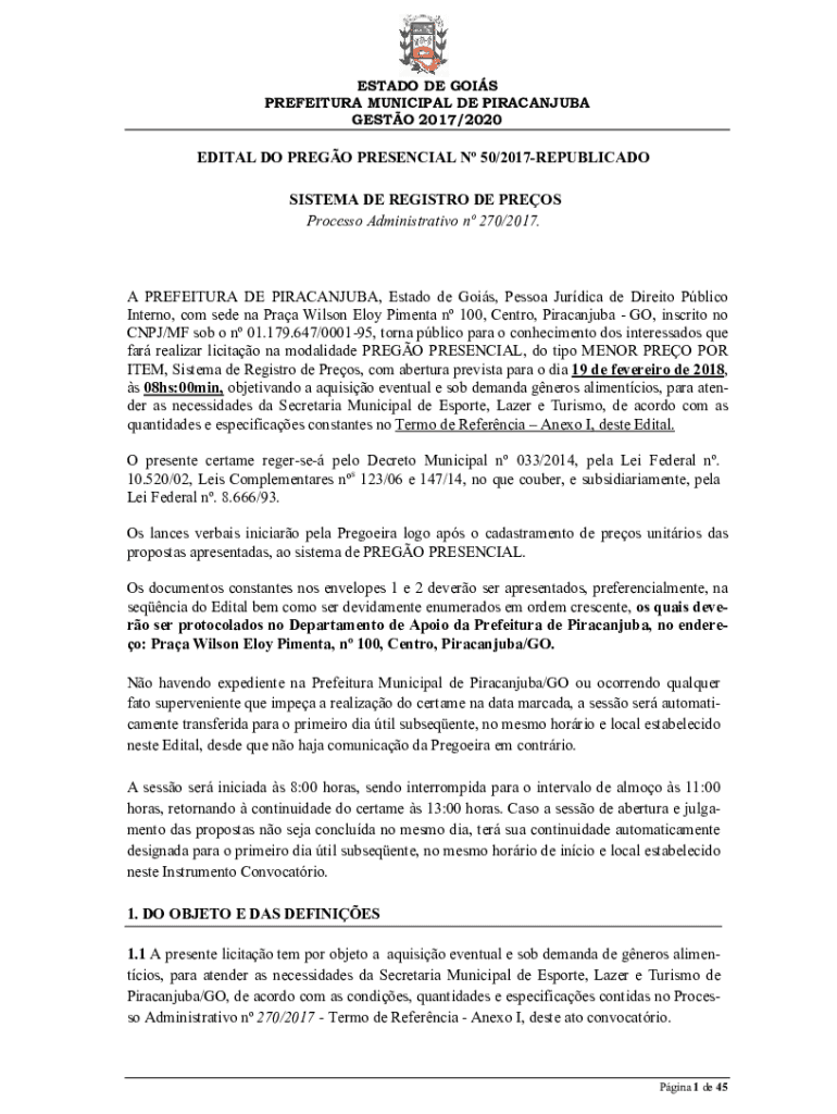 ESTADO DE GOIS PREFEITURA MUNICIPAL DE PIRACANJUBA GESTO 2017/2020EDITAL DO PREGO PRESENCIAL N 50/2017REPUBLICADO SISTEMA DE REGISTRO DE PREOS Processo Administrativo n 270/2017.A PREFEITURA DE PIRACANJUBA,