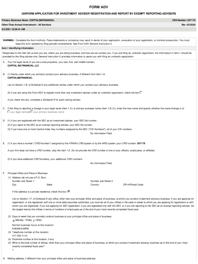 FORM ADV UNIFORM APPLICATION FOR INVESTMENT ADVISER REGISTRATION AND REPORT BY EXEMPT REPORTING ADVISERS Primary Business Name: CAPITAL360FINANCIALCRD Number: 297178OtherThanAnnual Amendment All Sections