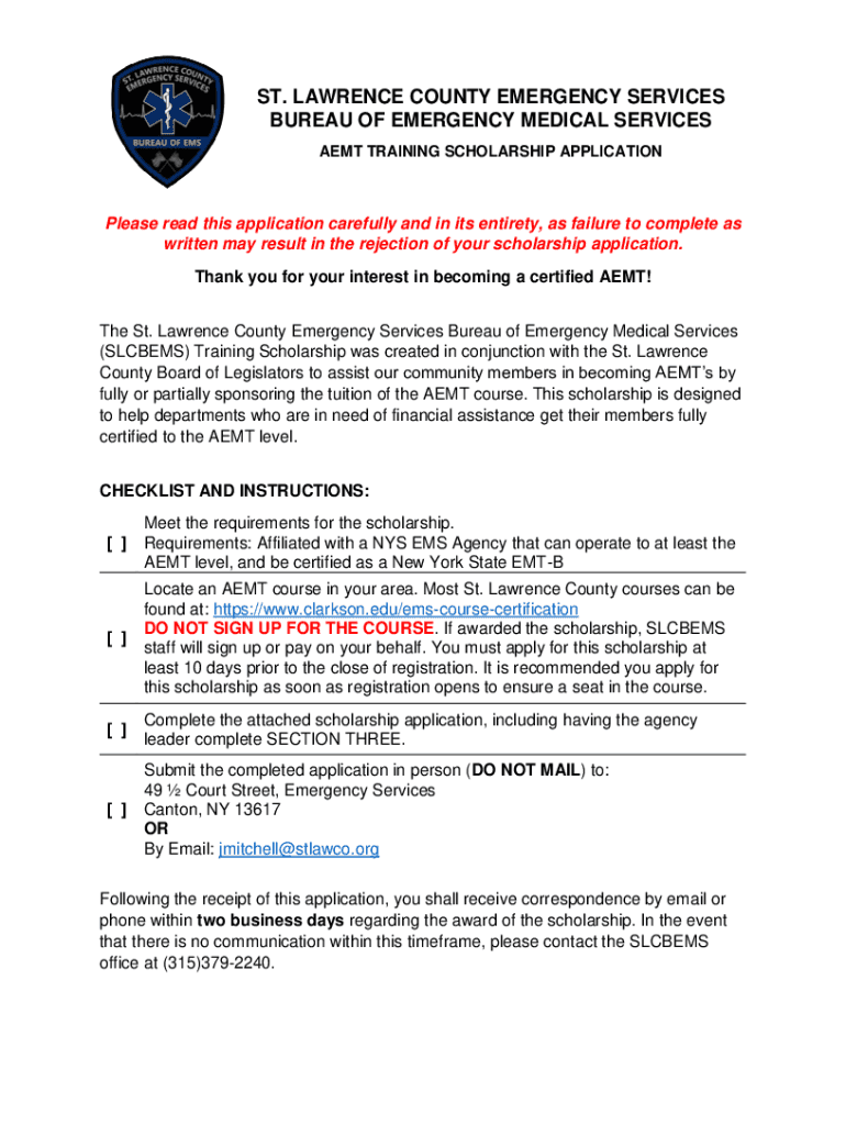 EMT TRAINING SCHOLARSHIP APPLICATIONPlease read this application carefully and in its entirety, as failure to complete as
