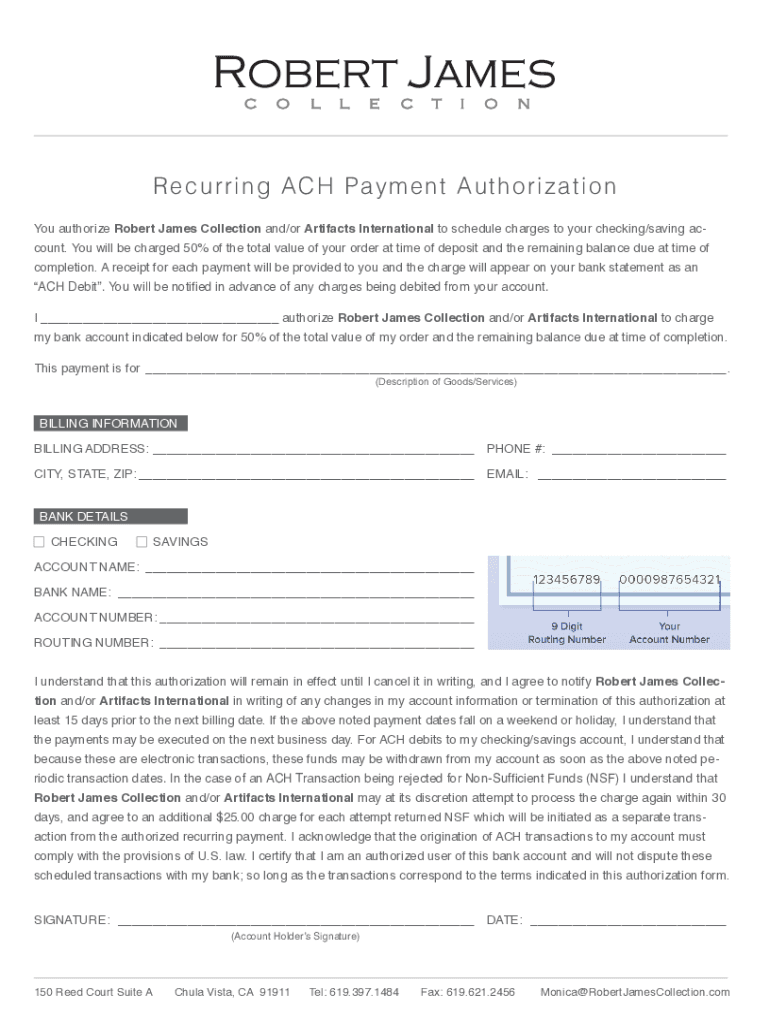 R ecur r ing A CH P a y m e n t Au th o ri z a ti o n You authorize Robert James Collection and/or Artifacts International to schedule charges to your checking/saving account. You will be charged