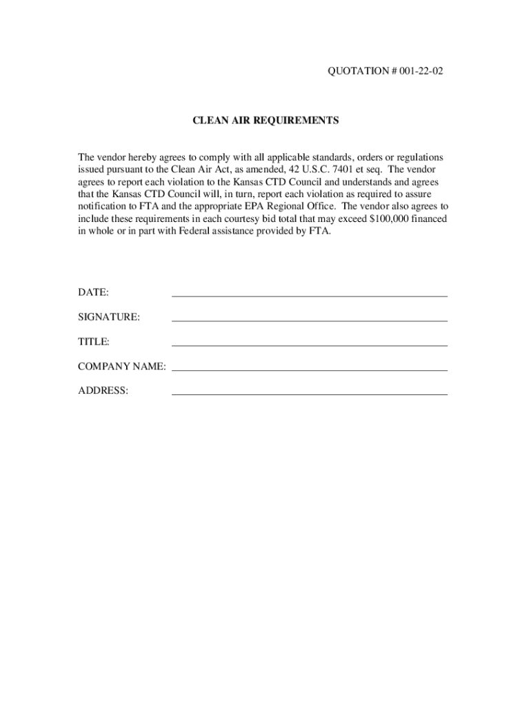 Get the free QUOTATION # 001-22-02 CLEAN AIR REQUIREMENTS The ...