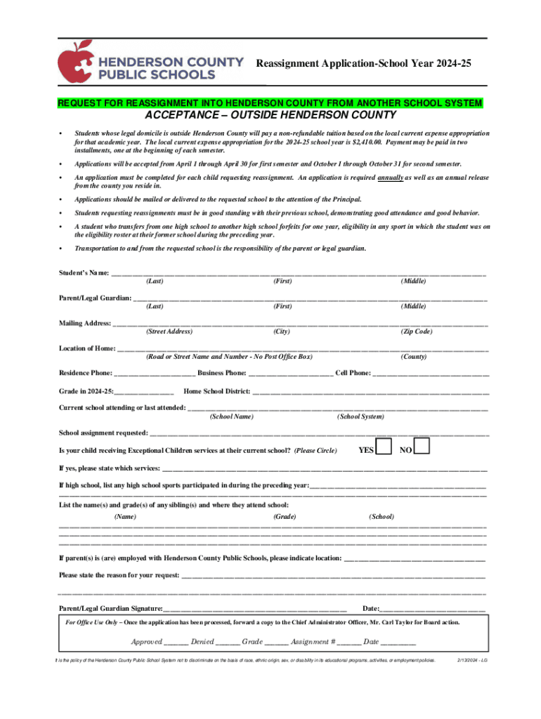 Reassignment ApplicationSchool Year 202425REQUEST FOR REASSIGNMENT INTO HENDERSON COUNTY FROM ANOTHER SCHOOL SYSTEMACCEPTANCE OUTSIDE HENDERSON COUNTY