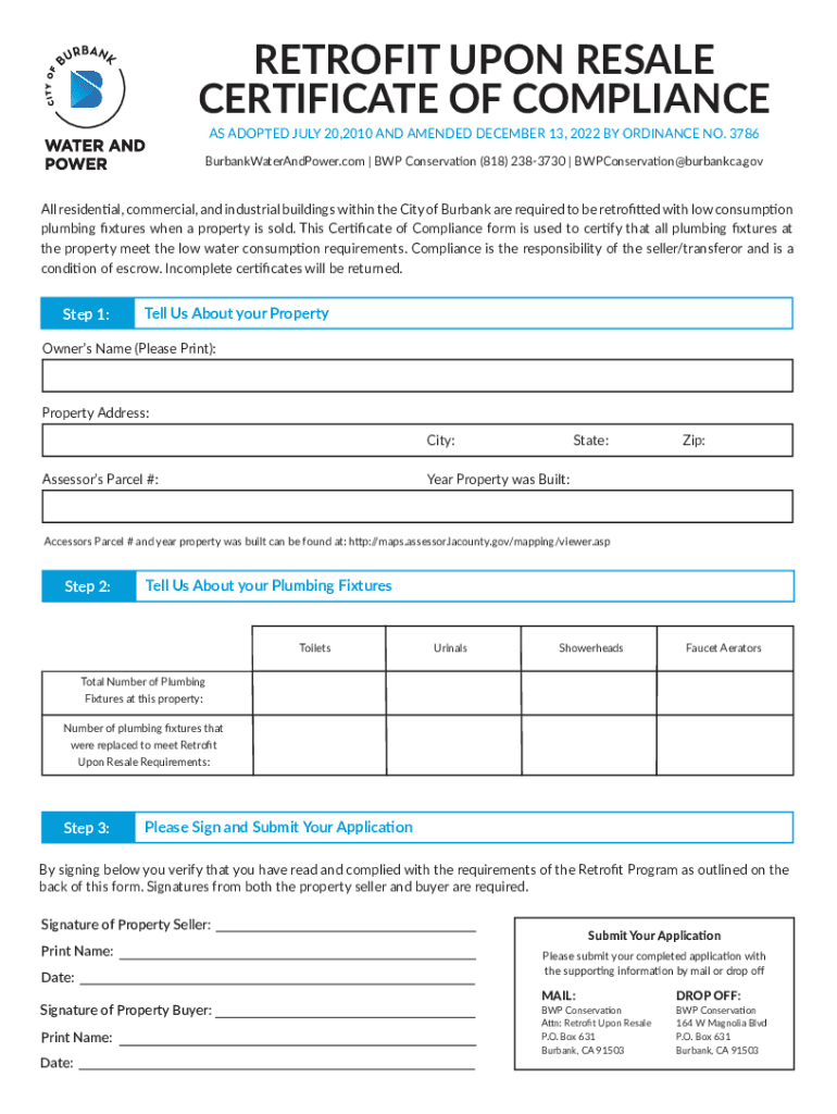 RETROFIT UPON RESALE CERTIFICATE OF COMPLIANCE AS ADOPTED JULY 20,2010 AND AMENDED DECEMBER 13, 2022 BY ORDINANCE NO. 3786BurbankWaterAndPower.com | BWP Conservation (818) 2383730 | BWPConservation@burbankca.govAll