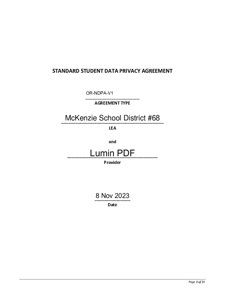 STANDARD STUDENT DATA PRIVACY AGREEMENTORNDPAV1___ AGREEMENT TYPEMcKenzie School District #68 ___ LEA andLumin PDF___ Provider8 Nov 2023 ___ DatePage 1 of 21This Student Data Privacy Agreement (DPA)
