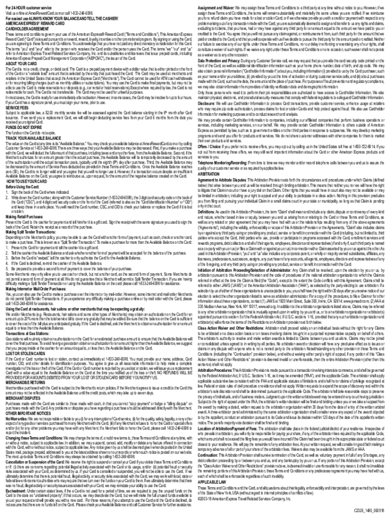 For 24HOUR customer service Visit us online at AmexRewardCard.com or call 18332496098. For easiest use ALWAYS KNOW YOUR BALANCE AND TELL THE CASHIER! AMERICAN EXPRESS REWARD CARD CARDHOLDER AGREEMENT