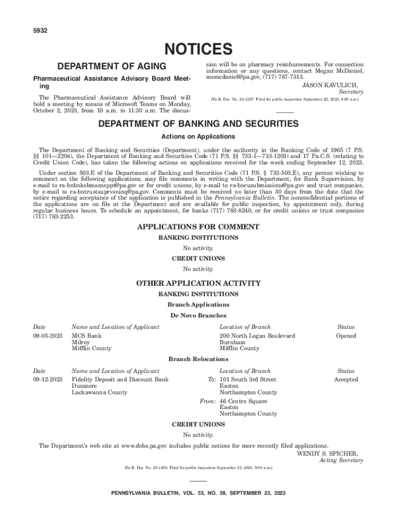 5932NOTICES DEPARTMENT OF AGING Pharmaceutical Assistance Advisory Board Meeting The Pharmaceutical Assistance Advisory Board will hold a meeting by means of Microsoft Teams on Monday, October 2,
