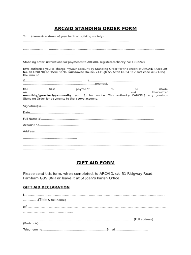 What is arcaid standing order Form?
