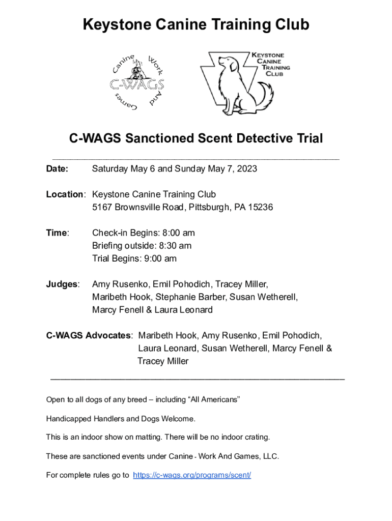 Keystone Canine Training ClubCWAGS Sanctioned Scent Detective Trial ___Date:Saturday May 6 and Sunday May 7, 2023Location: Keystone Canine Training Club 5167 Brownsville Road, Pittsburgh, PA 15236