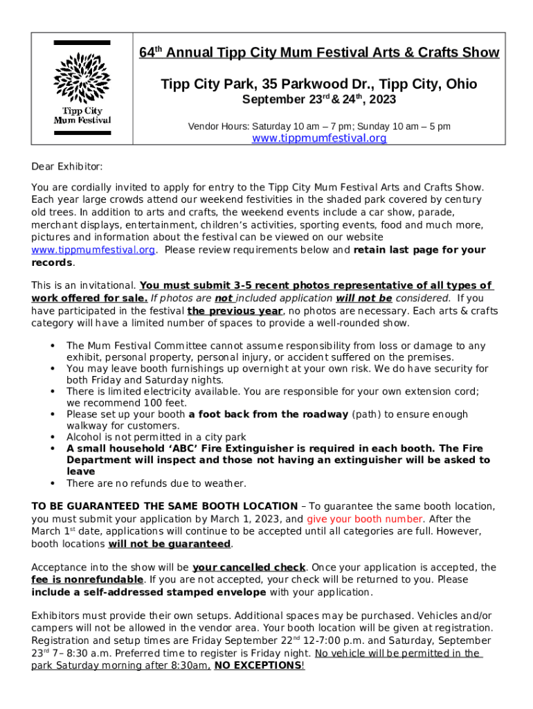 Instructions for the 64th Annual Tipp City Mum Festival Arts & Crafts Show form